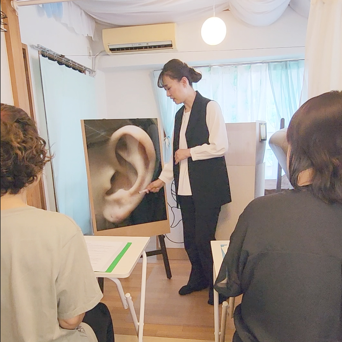 90個の耳ツボの位置などを勉強。耳つぼの施術ができるようになります。